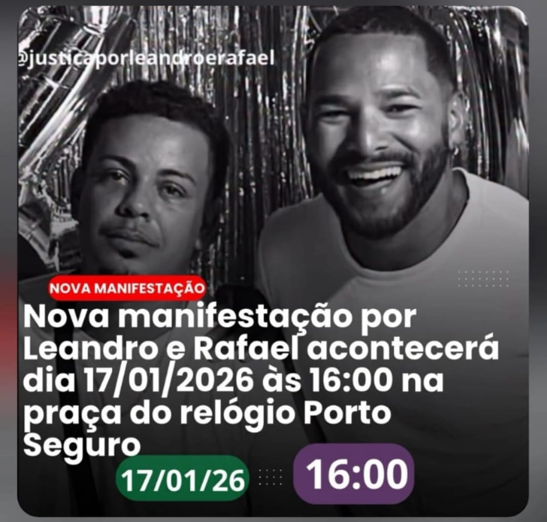 Uma nova manifestação por justiça em memória de Rafael de Jesus Santana e Leandro Neris dos Santos será realizada neste sábado, 17 de janeiro, às 16h, na Praça do Relógio...