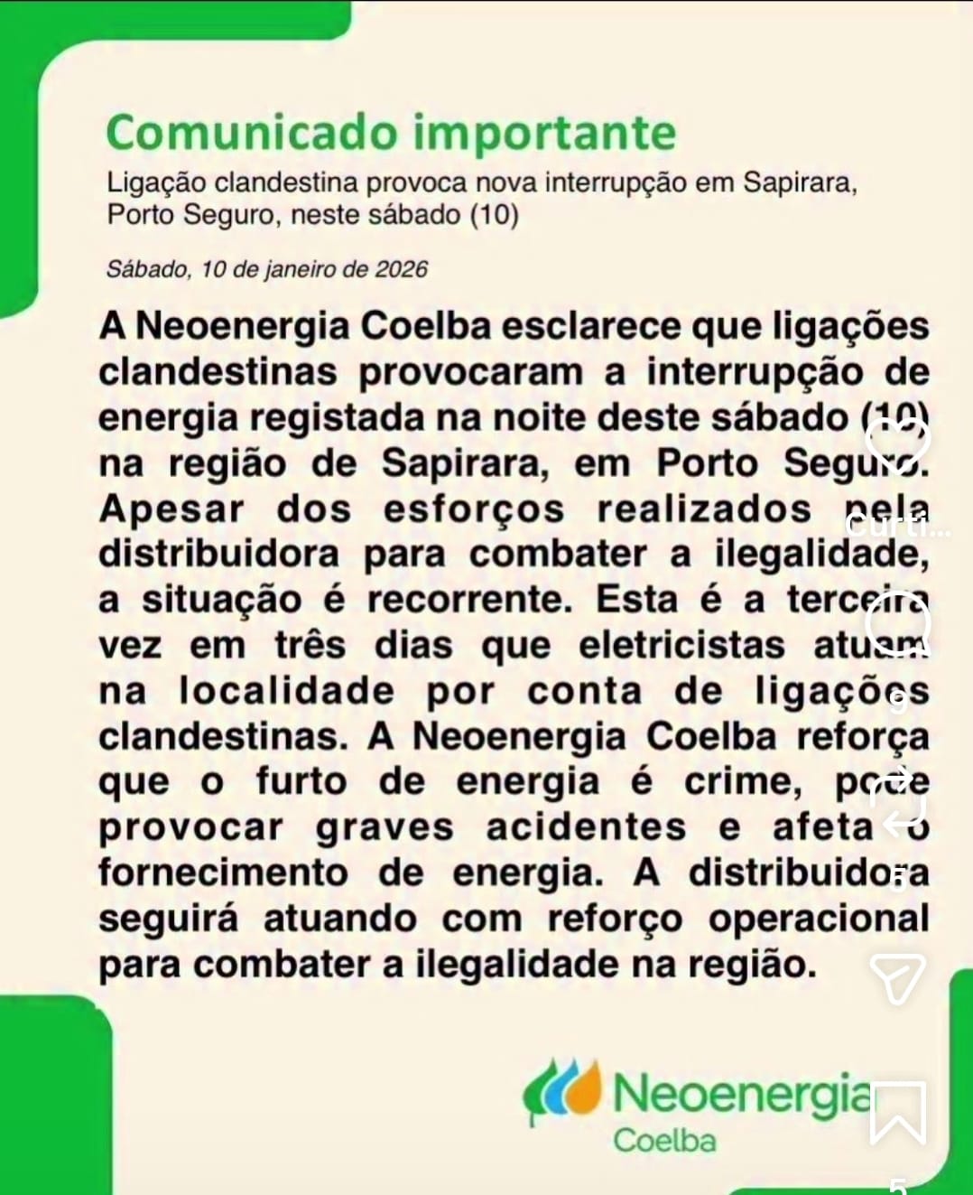 Nas redes sociais, circula um comunicado atribuído à Coelba — concessionária responsável pelo fornecimento de energia elétrica — informando que os desligamentos ocorreram em razão da “remoção de ligações e redes consideradas clandestinas”, com o objetivo de corrigir sobrecargas no sistema. A justificativa, no entanto, levanta uma série de questionamentos por parte dos moradores.