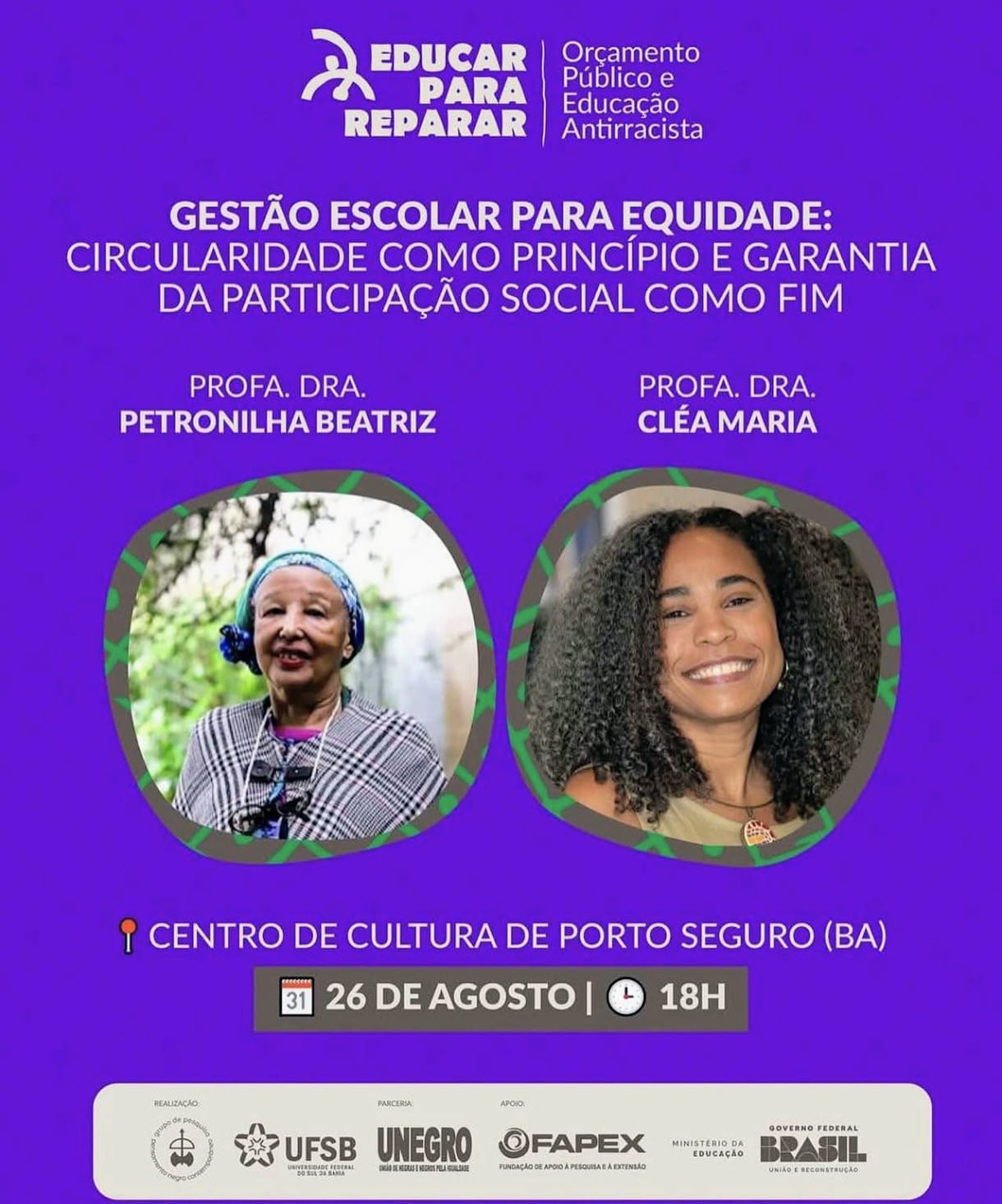 No dia 26 de agosto, às 18h, o Centro de Cultura de Porto Seguro recebe a Aula Pública "Gestão Escolar para Equidade: circularidade como princípio e garantia da participação social como fim".As professoras doutoras Petronilha Beatriz e Cléa Maria vão…